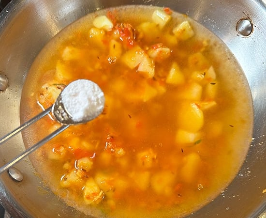 Then add 2 cups of water (16 oz/480ml) and stir. Add 1 teaspoon of sendha namak/rock salt (or regular salt if not making this for fast) and 1/8 teaspoon of ground black pepper. Adjust the salt and pepper as per your taste.