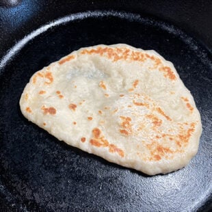 4. Use cast iron skillet to cook the naan: it gives great results and I highly recommend cooking on cast iron. You can either cook the naan entirely on cast iron or if you have a gas stove, you can directly cook it on heat to char it.