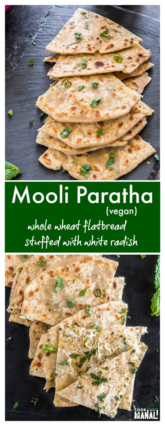 Mooli Paratha is a whole wheat flatbread stuffed with grated mooli aka white radish. It’s lightly seasoned with spices and makes a wholesome breakfast or lunch.