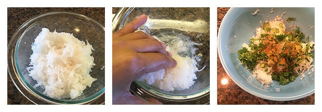 - Transfer this squeezed mooli to another bowl. Add chopped cilantro, ajwain, coriander powder, garam masala and chopped green chili.