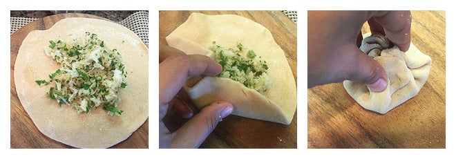 - Bring all the edges together and pinch to seal the edges. Flatten the dough ball using your hands.