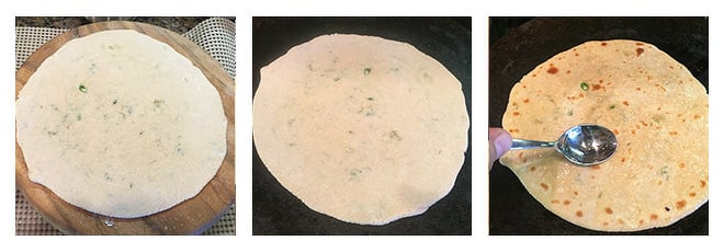 - Transfer the rolled paratha onto the hot tawa. Cook the side for a minute or two and then flip over. Apply oil [around 1/4 teaspoon] on the half-cooked side and flip again.