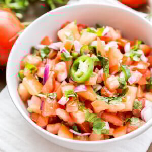 This recipe uses fresh tomatoes, mostly the salsa you find in restaurants is made using canned tomatoes. So this isn’t like the salsa you get in restaurants but rather a simple salsa recipe using fresh tomatoes. This can be put together in minutes. Just chop everything and mix them together and voila you are done! Super simple.