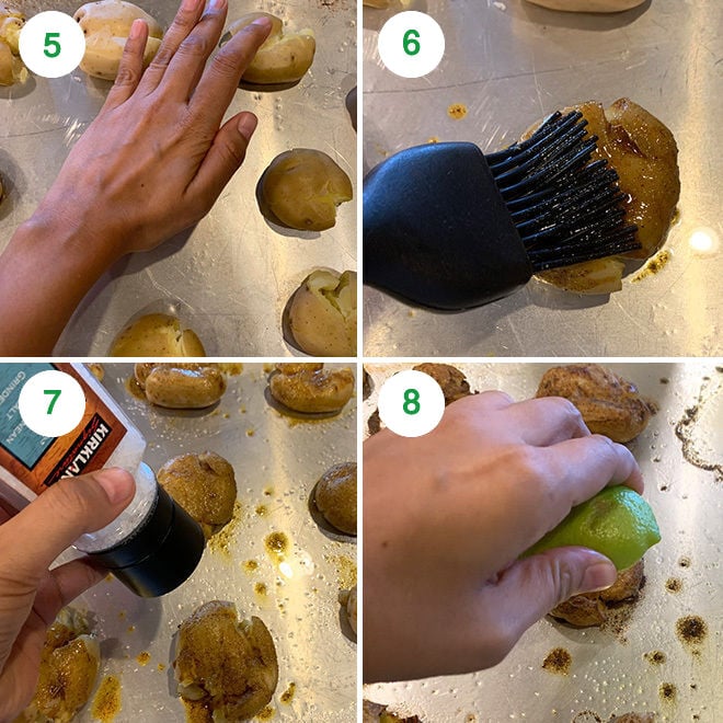 Next, make sure that you smash them well. The thinner the potatoes are smashed, the crispier they will get in the oven.