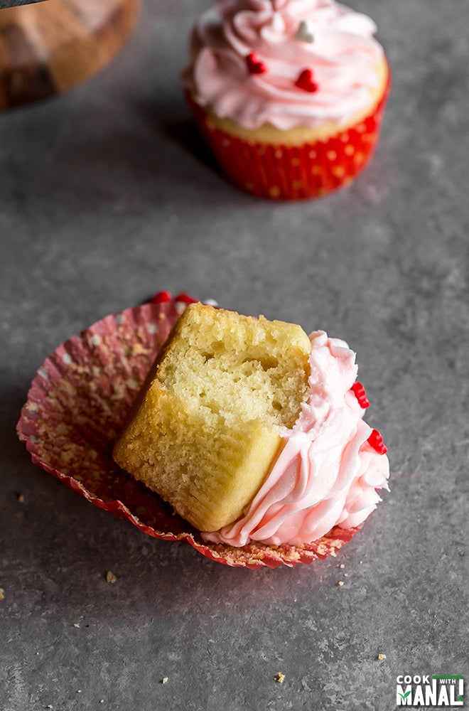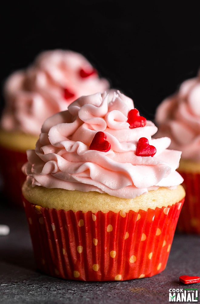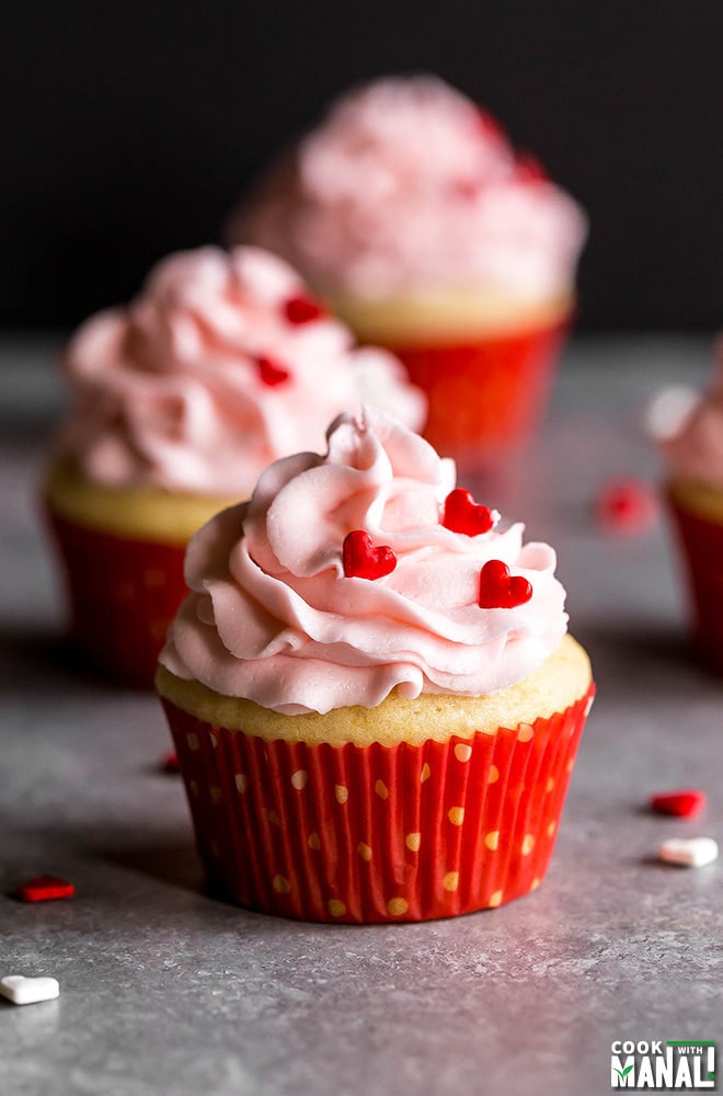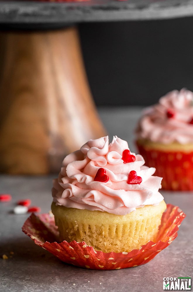 These cupcakes I baked yesterday and they are on the blog today! I don’t have a basic Eggless Vanilla Cupcakes recipe on the blog and I know a lot of you love eggless bakes and so I thought Valentine’s Day would be perfect to share these.