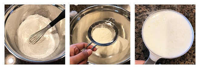 - Start adding the flour mix and milk-vinegar mixture in parts. Start by adding one part of the flour mix, then add one part of the milk-vinegar mixture.