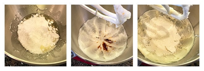 “Using paddle attachment of your stand mixer or using your hand mixer, mix together oil and powdered sugar. Mix till creamy and well combined.”. You mix the oil and sugar. Then add vanilla and then add in the dry ingredients.