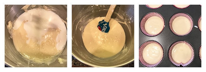- Using an ice cream scoop (or any spoon), fill the cupcakes liners 2/3 full with the batter.
