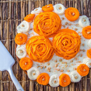 I love a loaded Carrot Cake – but even more than this yummy carrot-filled-cake are those amazing BRIGHT orange rosettes on top of this cake. BEAUTIFUL!