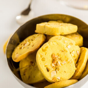 These Kaju Pista Cookies are hugely popular in India. They are eggless and made with pistachios, cashews and flavored with cardamom powder. They are so good with a cup of chai and also perfect for giving as gift!