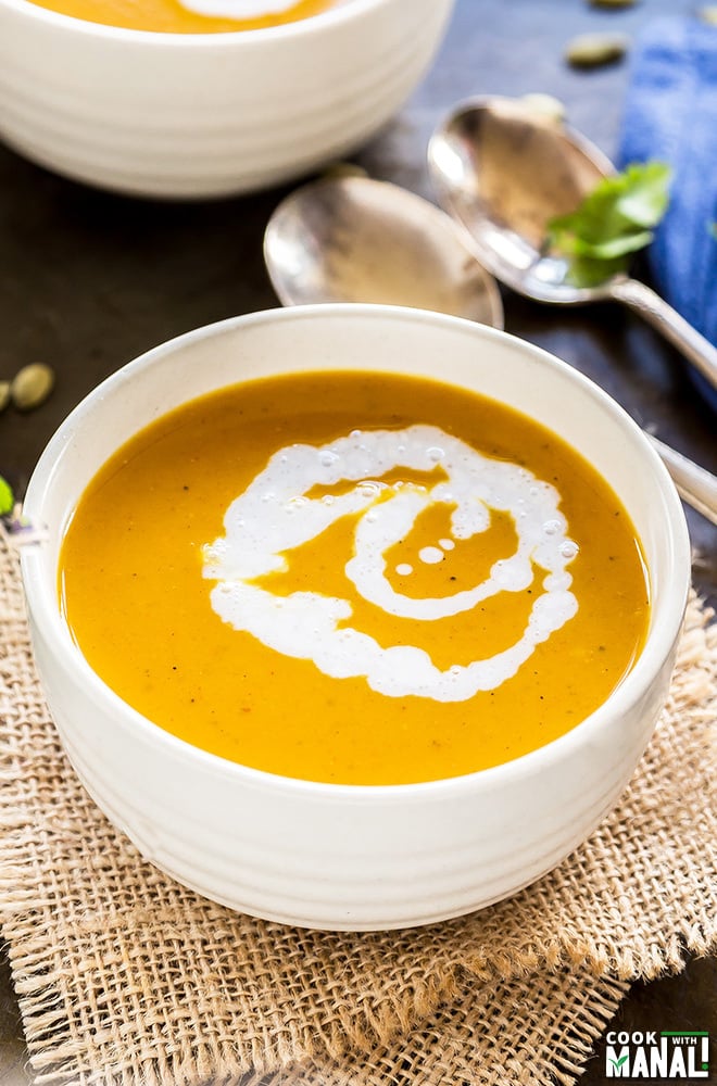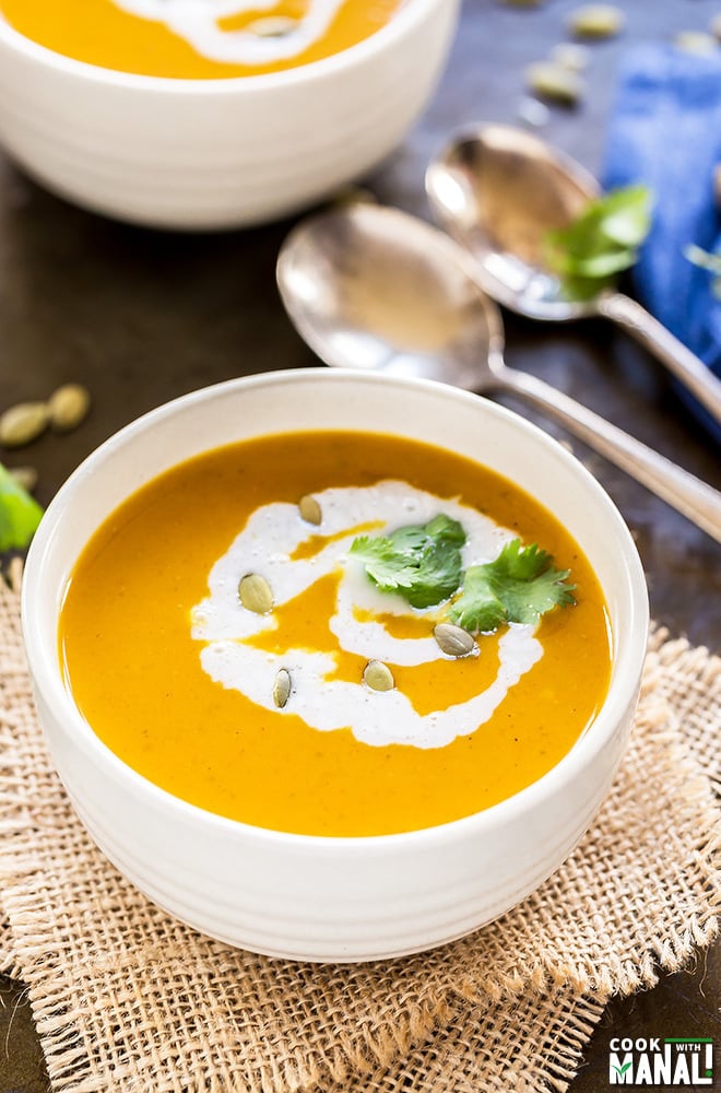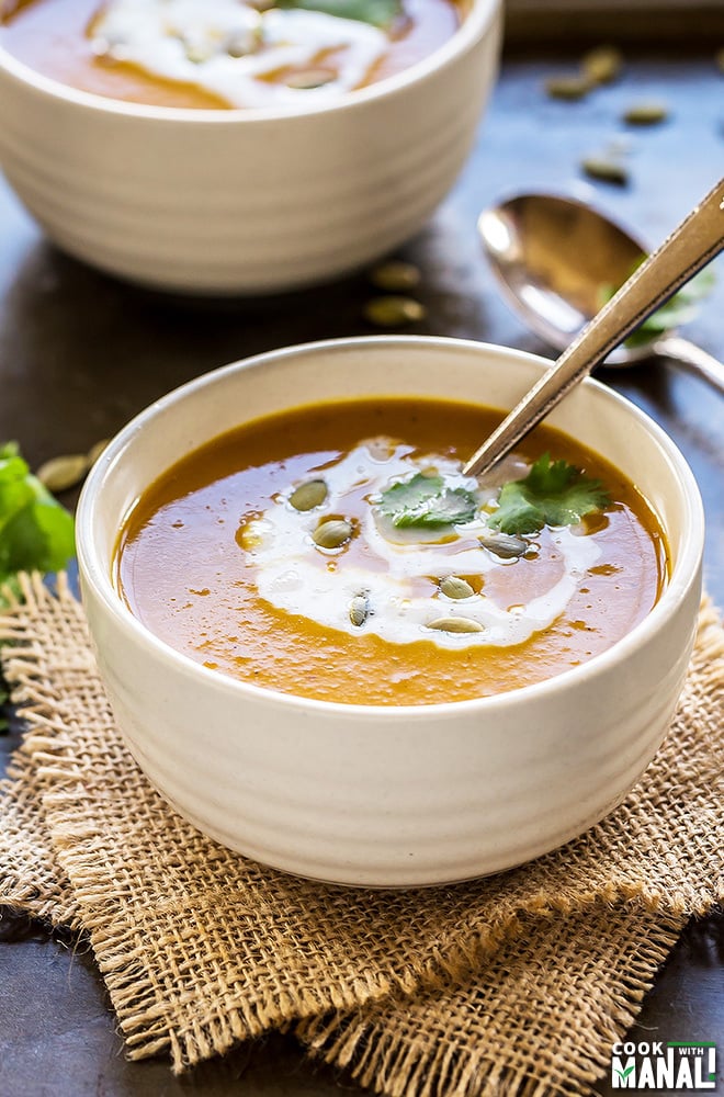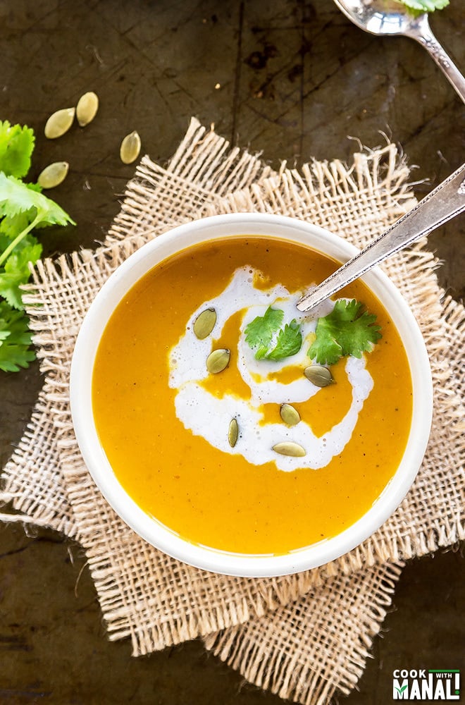 - Garnish the curried butternut squash apple soup with cilantro, coconut cream and serve hot!