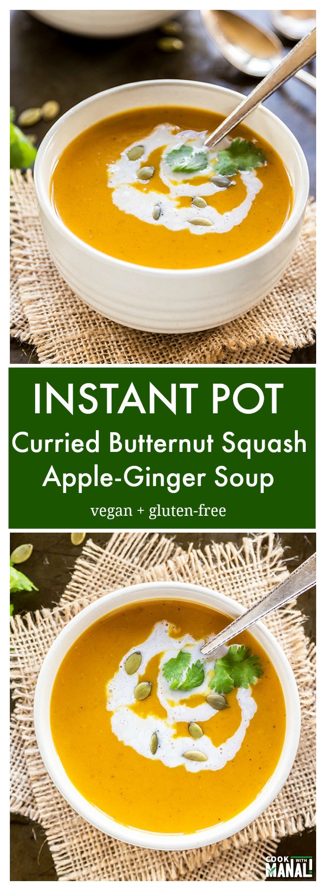 I am always excited to share Instant Pot recipe with you guys, just because they are mostly so easy to make and I know you guys love them as much as I do! I have been meaning to share lots of Indian IP recipes and I promise to share them here very soon but till then let’s talk about this curried soup. I love soup, if it was left to me, I would have soup for dinner everyday! Remember I shared this vegan butternut squash soup couple of years back? So I drew inspiration from that one and came up with this soup. This one is also vegan but so much more flavorful with the addition of apple and ginger.