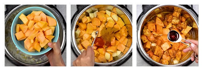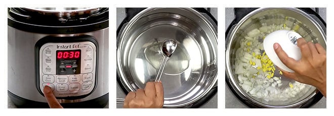- Press saute button on the IP. Once the pot is hot, add oil to the inner pot.