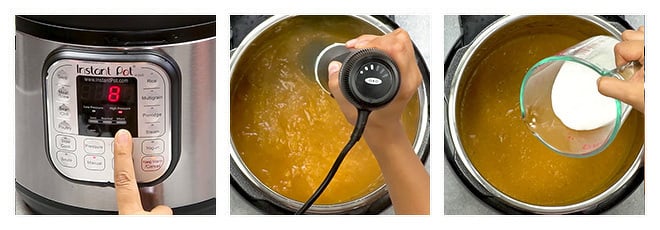 5 minutes Natural Pressure Release (NPR) and then do a quick release. Blend the soup using an immersion blender. If you don’t have an immersion blender, you can use your regular blender – just make sure that the soup cools down a bit before you try to blend it.