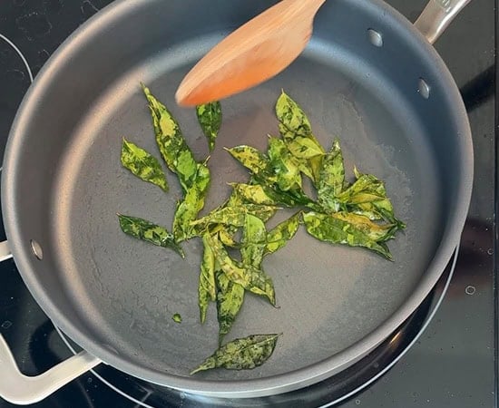 - While the potatoes are in the air fryer, work on the curry leaves dip. Add 1 teaspoon of oil to a pan on medium heat. Then add around 35-40 curry leaves to it and sauté for a few minutes or until the curry leaves crisp up. You would be able to hear the crispiness. At this point, remove the curry leaves into a bowl.