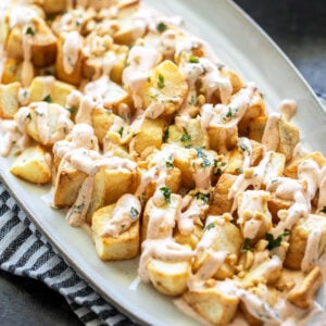 When I went to Spain, I ate patatas bravas almost every day. Not because it was my favorite, but because it was one vegetarian option that was on the menu of every restaurant we went to! These Indian style patatas bravas swap the deep fried potatoes with air fried ones and the tomato bravas sauce for a curry leaf infused sour cream dip.