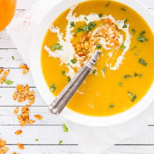 Remember I posted these spicy roasted pumpkin seeds at the beginning of the week? Well, I am ending the week with this Curried Pumpkin Soup which I topped with those spicy seeds. The soup is super comforting and will become your new favorite fall soup! It will also be perfect for your Halloween or Thanksgiving entertaining!
