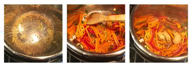 Press the saute button on your Instant Pot. Once it displays hot, add oil and then add the minced garlic and ginger. Saute for a minute until garlic and ginger start changing color.