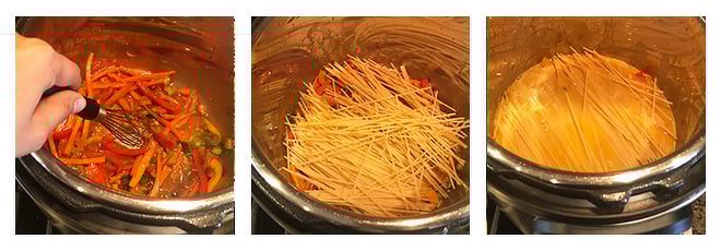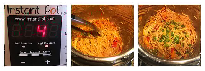 We loved this recipe with a few tweaks. First, I doubled it as I needed four servings. I cooked the veggies and then de-glazed with the water. Then I added the spaghetti (I used linguine) cut in half as directed and criss-crossed. I pushed down on the pasta to submerge. Then I added the sauce on top. My rule of thumb is 1/2 of the cooking time of pasta plus 5 – 10 minutes natural release. My family likes softer pasta. I also used 1/2 veg. oil and 1/2 sesame oil and garnished with green onion and sesame seeds. Good mixing is required at the end to get the veggies disbursed. This was a winner in my house! P.S. No burn message.