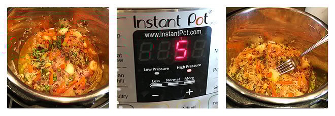 - Let the pressure release naturally for 5 minutes and then release the remaining pressure manually. Open the pot and fluff the rice with a fork.