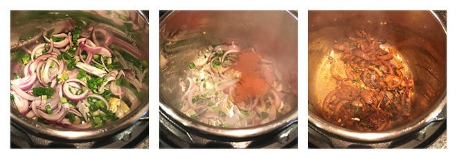 - Press the saute button on your Instant Pot. Once it displays hot, add the oil and then add the chopped ginger, garlic, red onion & spring onion.